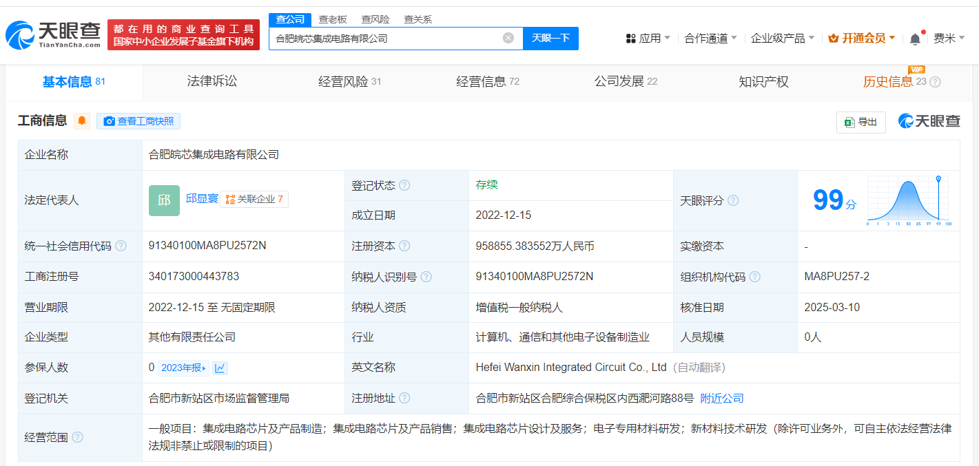 该公司成立于2022年12月,法定代表人为邱显寰,经营范围含集成电路芯片及产品制造、集成电路芯片及产品销售、电子专用材料研发等,现由晶合集成(688249) 及上述新增股东共同持股。