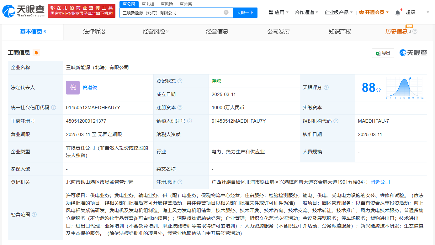 天眼查App显示,近日,三峡新能源(北海)有限公司成立,法定代表人为倪道俊,注册资本1亿,经营范围包括以自有资金从事投资活动、海上风电相关系统研发、发电机及发电机组制造、海上风力发电机组销售等,由三峡能源(600905)全资持股。