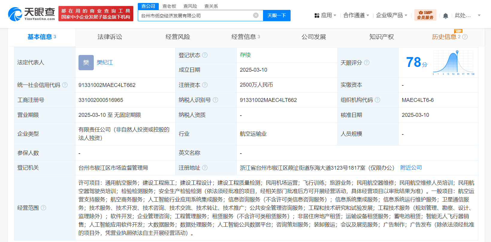 天眼查App显示,近日,台州市低空经济发展有限公司成立,法定代表人为樊纪江,注册资本2500万人民币,经营范围含通用航空服务、建设工程质量检测、旅游业务、民用航空器驾驶员培训、航空商务服务、人工智能行业应用系统集成服务、信息咨询服务等。股东信息显示,该公司由台州市交通投资集团有限公司全资持股。