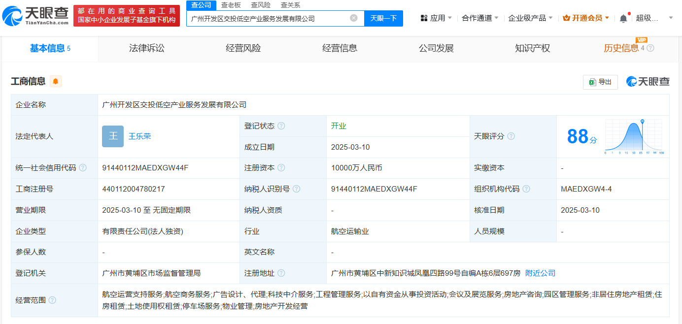 天眼查App显示,近日,广州开发区交投低空产业服务发展有限公司成立,法定代表人为王乐荣,注册资本1亿人民币,经营范围包括航空运营支持服务、航空商务服务、以自有资金从事投资活动、园区管理服务等。股东信息显示,该公司由广州开发区低空产业发展有限公司全资持股,后者为广州开发区交通投资集团有限公司全资子公司。