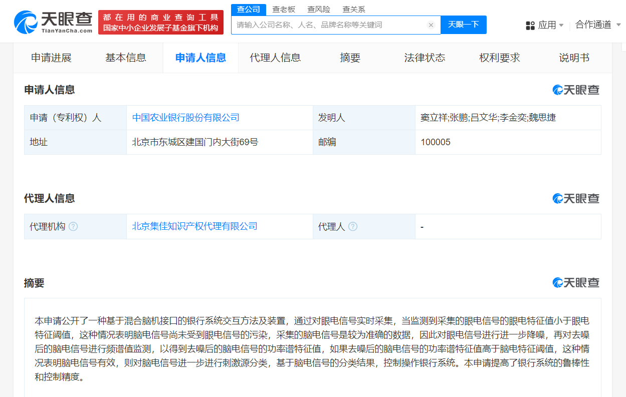 天眼查知识产权信息显示,近日,中国农业银行股份有限公司申请的“一种基于混合脑机接口的银行系统交互方法及装置”专利公布。