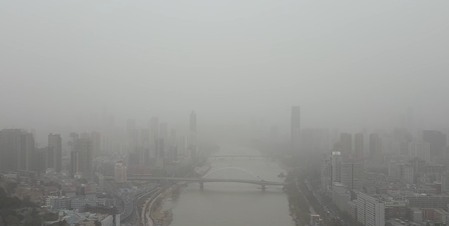 3月11日,兰州遭遇沙尘天气,黄河两岸被浮尘覆盖。在无人机航拍视角下,兰州城区弥漫在沙尘中,昔日清晰可见的高楼大厦,此刻在沙尘的侵袭下,变得轮廓模糊。