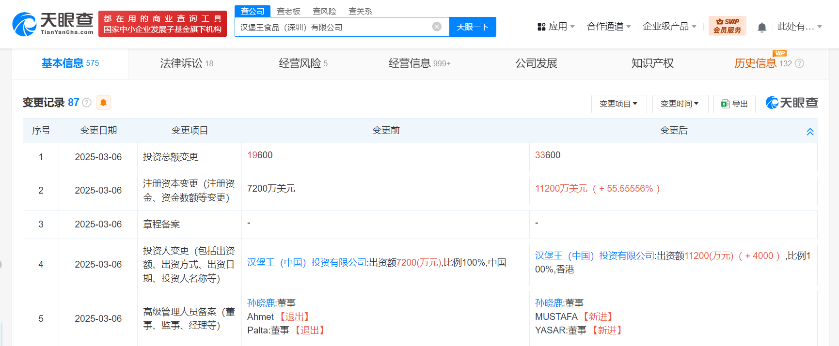 天眼查App显示,近日,汉堡王食品(深圳)有限公司发生工商变更,注册资本由7200万美元增至1.12亿美元,增幅约56%,同时,多位主要人员均发生变更。