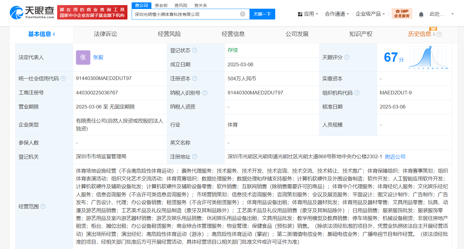天眼查App显示,近日,深圳光明橙小狮体育科技有限公司成立,法定代表人为张毅,注册资本504万人民币,经营范围含体育场地设施经营、票务代理服务、体育保障组织、组织体育表演活动、组织文化艺术交流活动、数据处理服务、人工智能应用软件开发、计算机软硬件及辅助设备批发等。股东信息显示,该公司由阿里巴巴旗下橙狮体育(深圳)有限公司全资持股。
