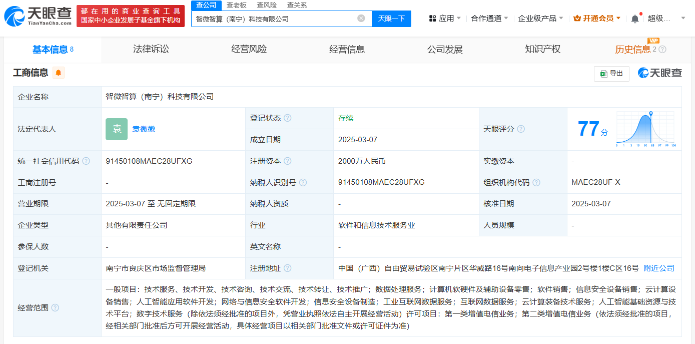 天眼查App显示,近日,智微智算(南宁)科技有限公司成立,法定代表人为袁微微,注册资本2000万人民币,经营范围包括云计算设备销售、人工智能应用软件开发、互联网数据服务、云计算装备技术服务、人工智能基础资源与技术平台等。股东信息显示,该公司由智微智能(001339)全资持股。