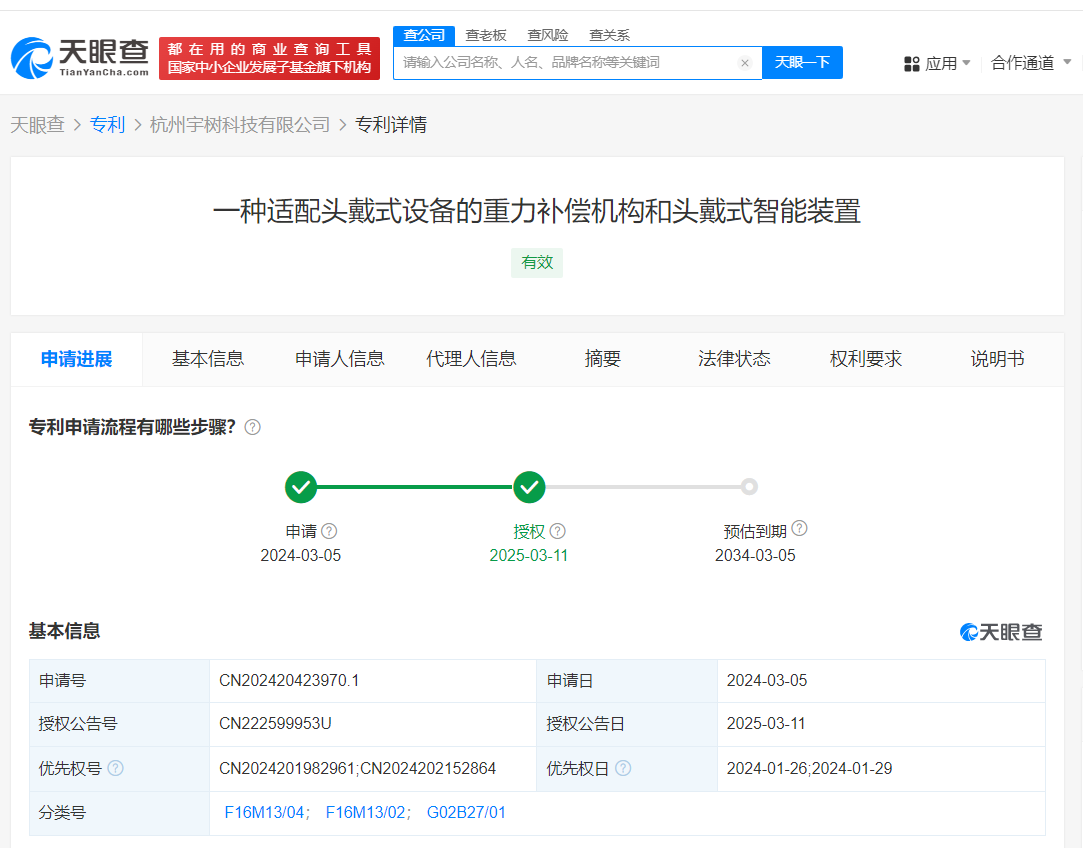 天眼查知识产权信息显示,近日,杭州宇树科技有限公司申请的“一种适配头戴式设备的重力补偿机构和头戴式智能装置”专利获授权。