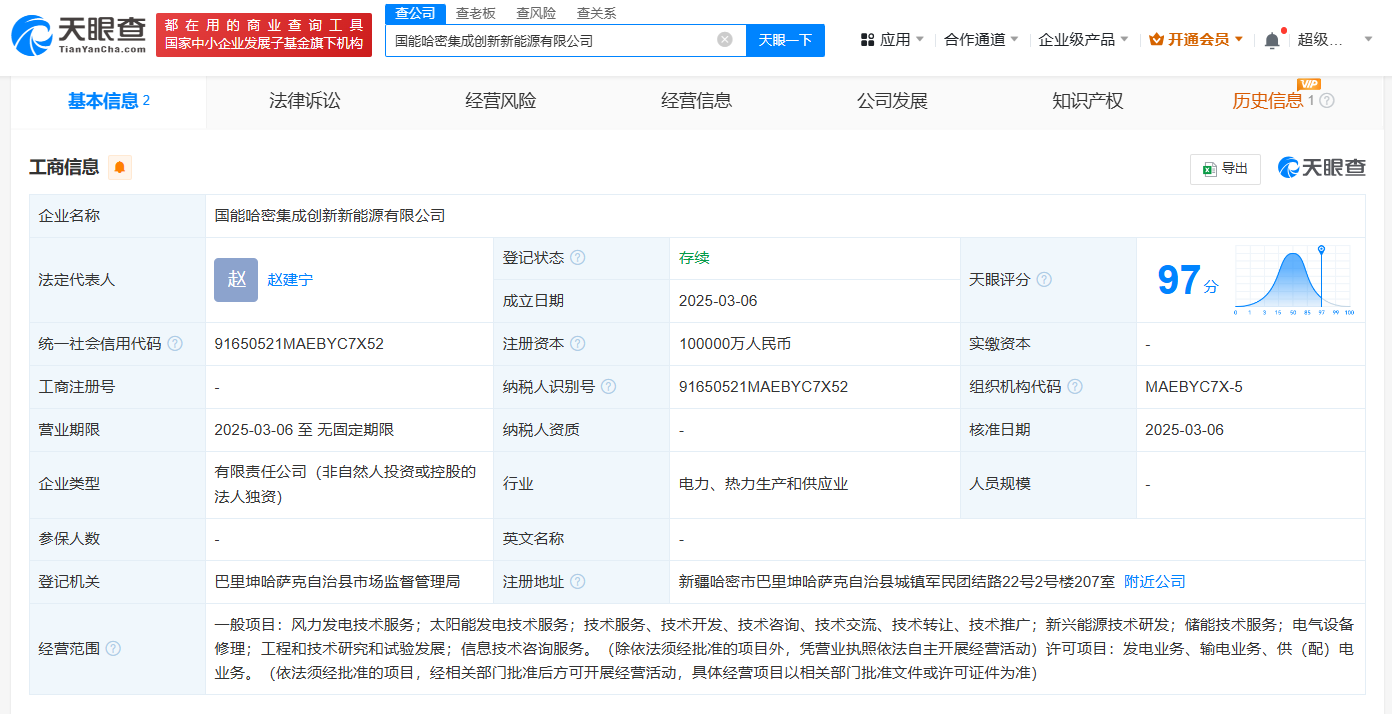 天眼查App显示,近日,国能哈密集成创新新能源有限公司成立,法定代表人为赵建宁,注册资本10亿人民币,经营范围包括风力发电技术服务、太阳能发电技术服务、新兴能源技术研发、储能技术服务等。股权全景穿透图显示,该公司由国家能源集团新疆哈密能源化工有限公司全资持股,后者为国家能源投资集团有限责任公司全资子公司。