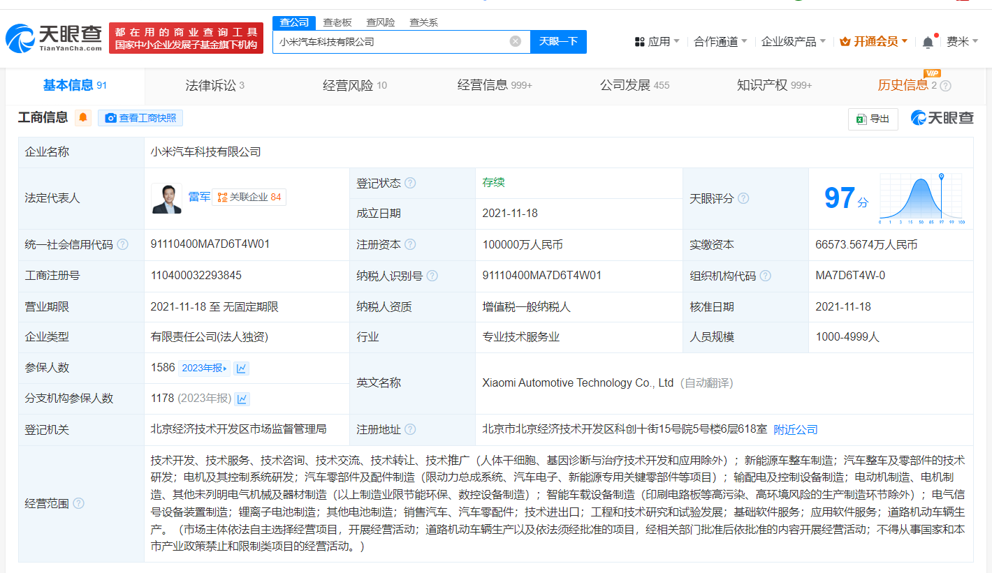 该公司成立于2021年11月,法定代表人为雷军,注册资本10亿人民币,经营范围包括新能源车整车制造、汽车整车及零部件的技术研发、电机及其控制系统研发、汽车零部件及配件制造等,由小米科技有限责任公司全资持股。