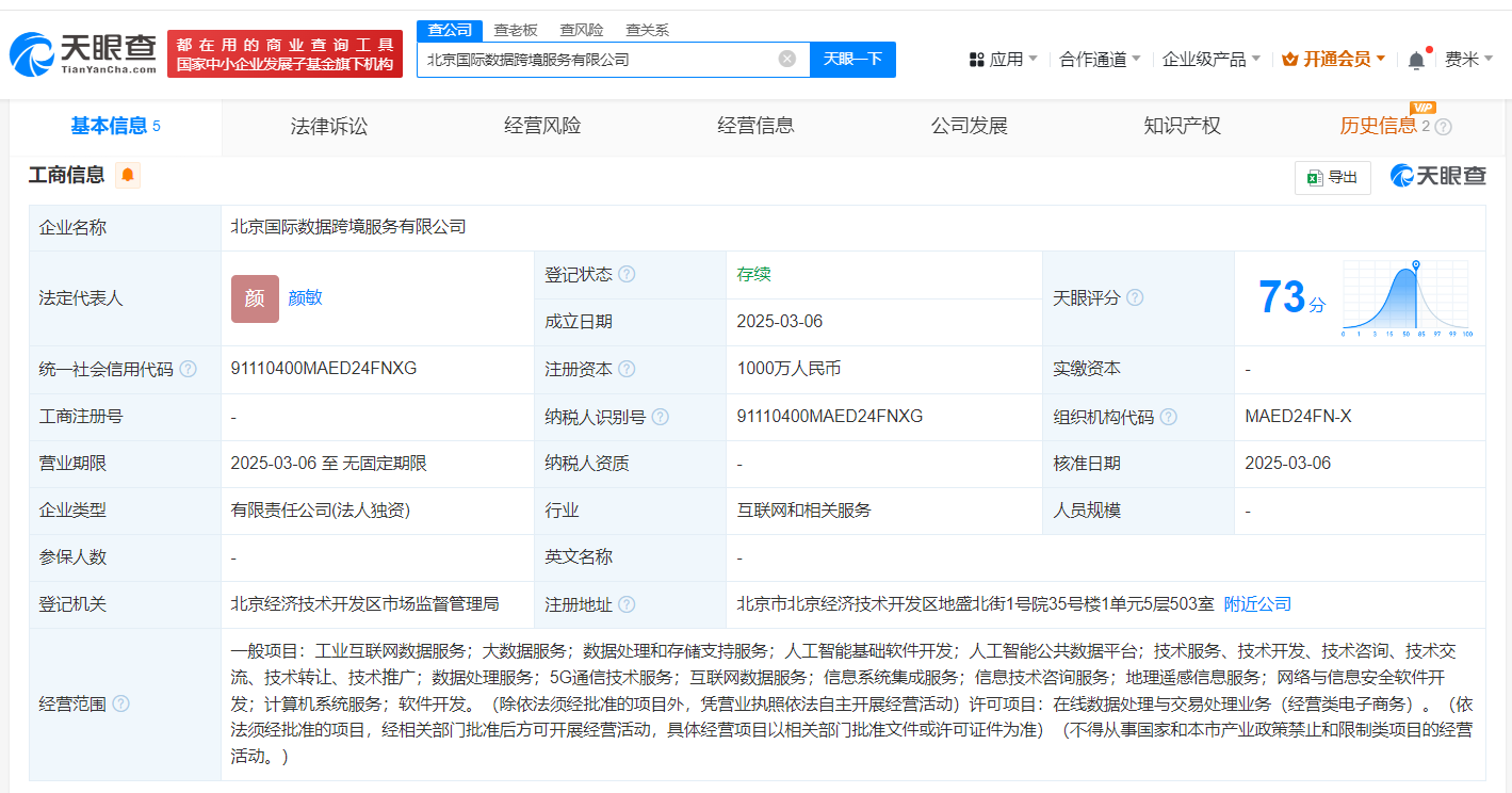 天眼查App显示,近日,北京国际数据跨境服务有限公司成立,法定代表人为颜敏,注册资本1000万人民币,经营范围含工业互联网数据服务、大数据服务、数据处理和存储支持服务、人工智能基础软件开发、人工智能公共数据平台、5G通信技术服务等,由北京亦庄智能城市研究院集团有限公司全资持股。