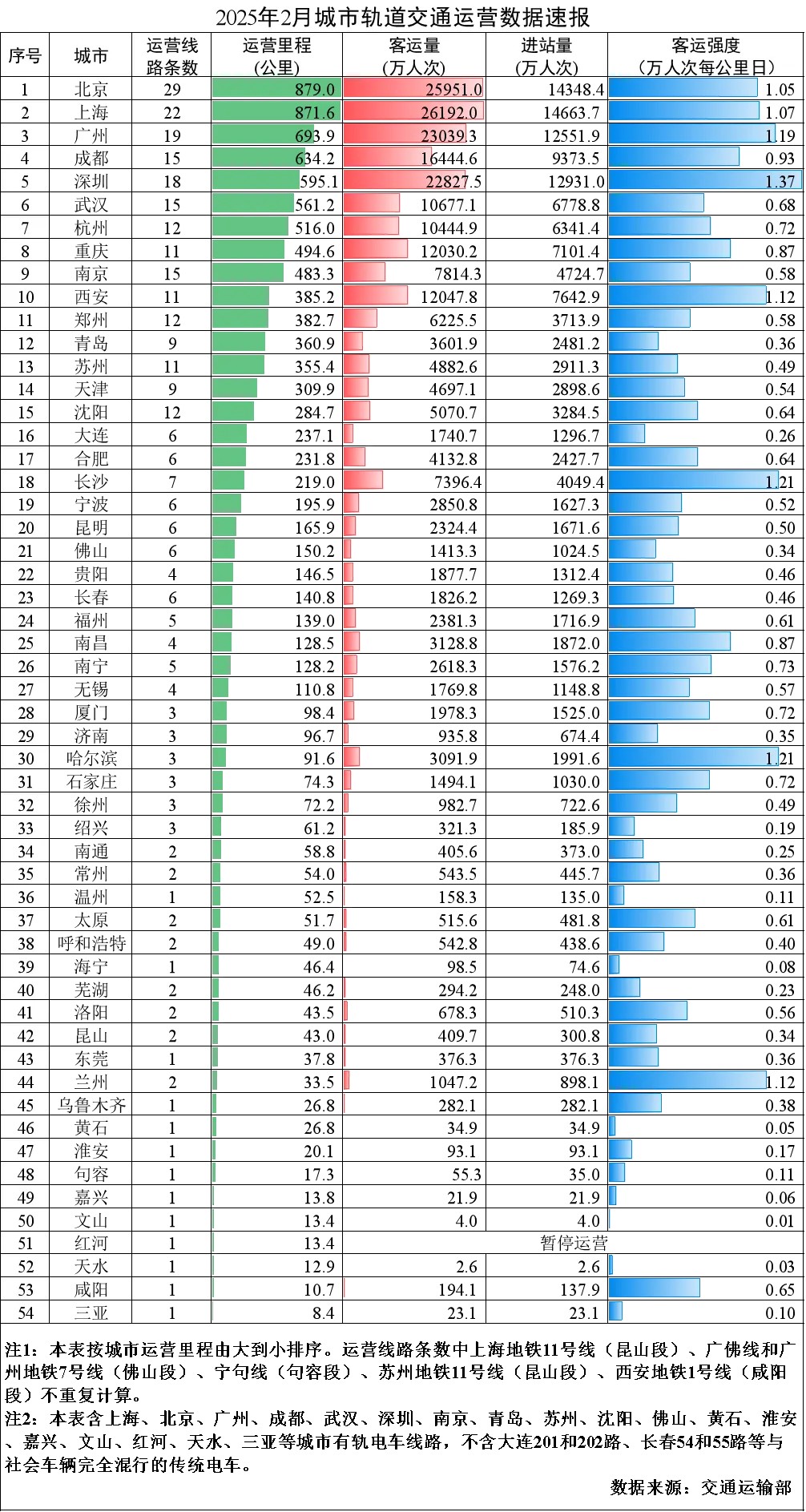 据交通运输部微信公众号消息,2025年2月,31个省(自治区、直辖市)和新疆生产建设兵团共有54个城市开通运营城市轨道交通线路326条,运营里程10975.8公里,实际开行列车330万列次,完成客运量24.0亿人次,进站量14.4亿人次。2月份,客运量环比减少0.8亿人次,减少3.2%,同比增加3.5亿人次,增加17.1%。2月份全国总运营里程的平均客运强度为0.782万人次每公里日,环比增加7.0%,同比增加12.8%。