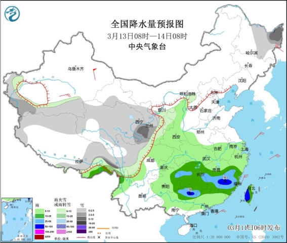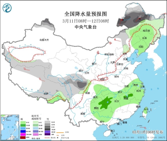 雨雪方面,今明两天,内蒙古东北部、东北地区中北部及新疆北部、西藏北部和东部、青海南部、川西高原等地的部分地区有小到中雪或雨夹雪,新疆北部、内蒙古东北部、黑龙江西部等地的部分地区有大到暴雪,局地大暴雪。明天起至15日,江南、华南、贵州东部、江汉东部及江淮等地将有中到大雨,部分地区有暴雨,上述地区局地并伴有短时强降水、雷暴大风等强对流天气。