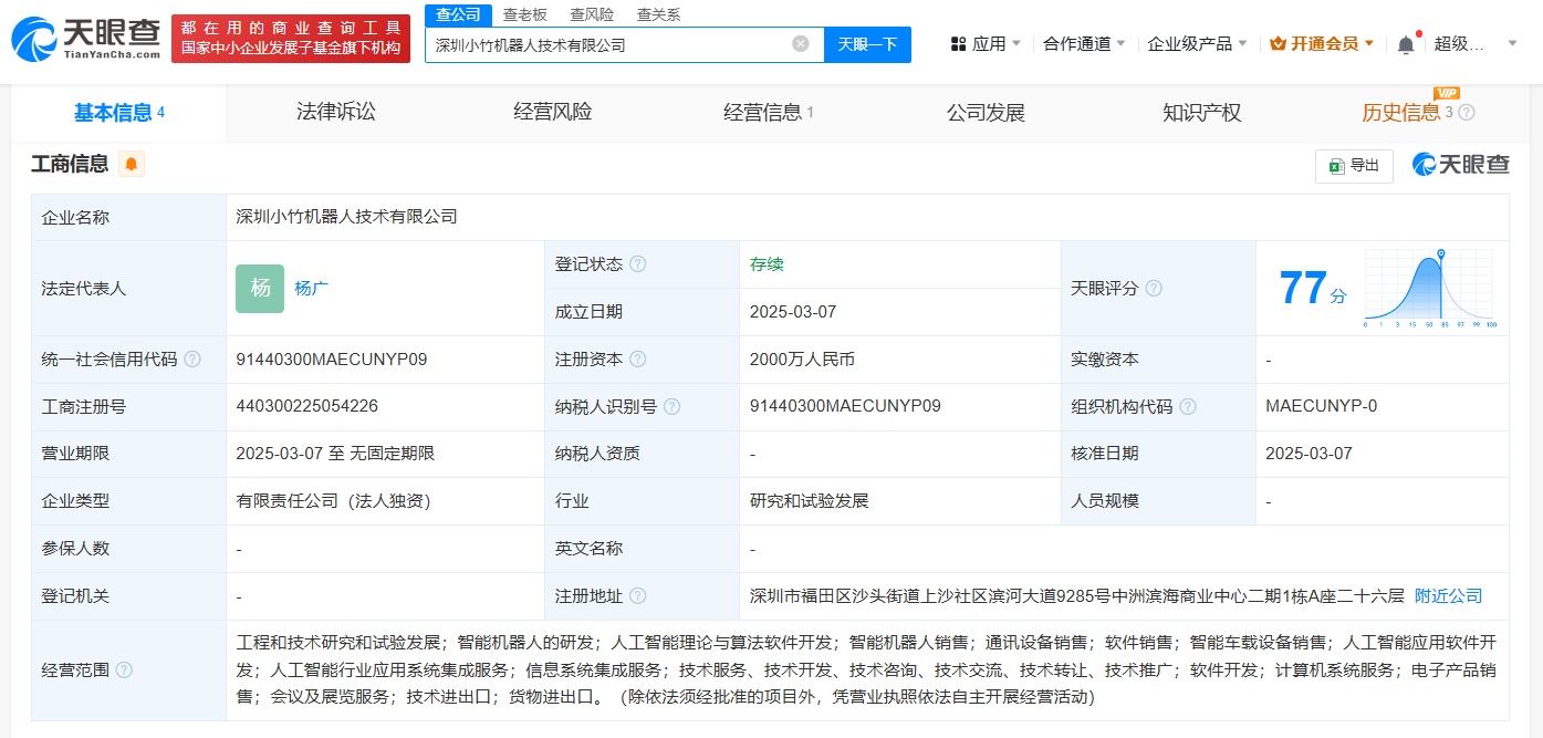 天眼查App显示,近日,深圳小竹机器人技术有限公司成立,法定代表人为杨广,注册资本2000万人民币,经营范围包括智能机器人的研发、人工智能理论与算法软件开发、智能机器人销售、人工智能应用软件开发等。股东信息显示,该公司由佑驾创新(HK.02431)全资持股。