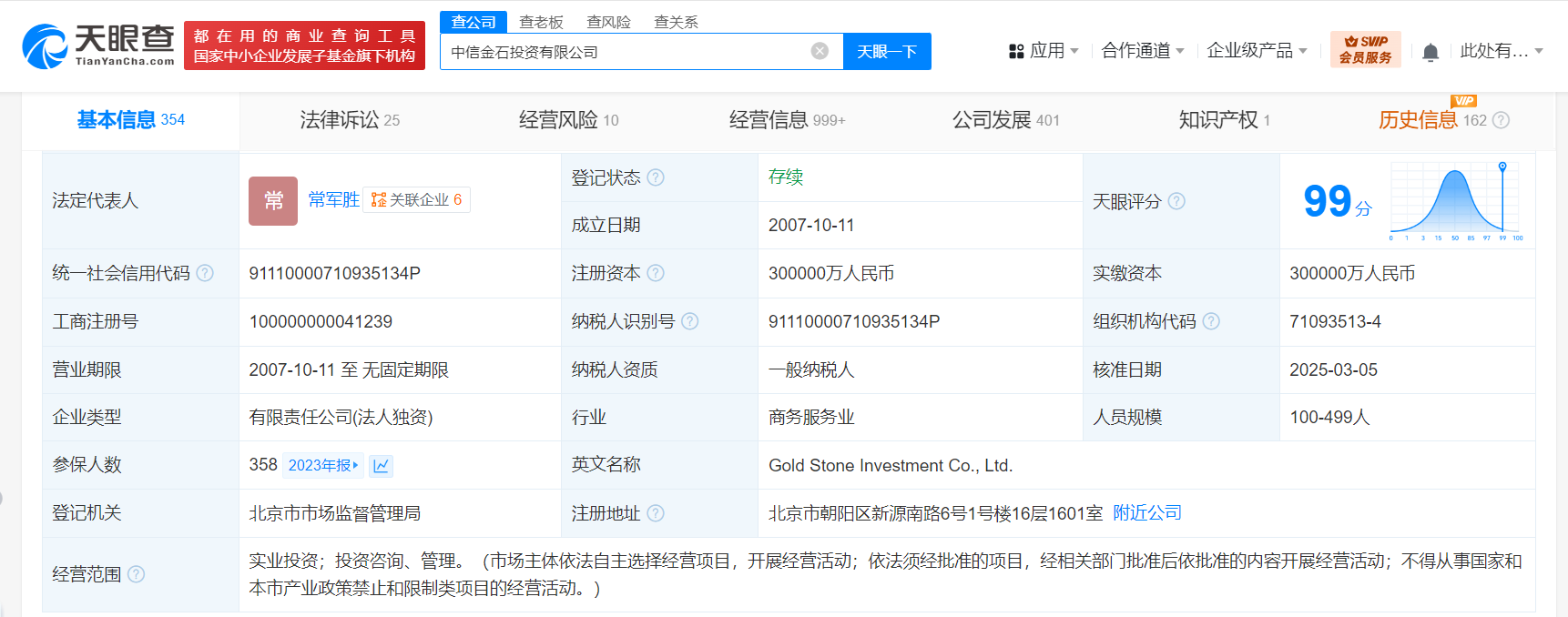 天眼查App显示,近日,金石投资有限公司发生工商变更,企业名称变更为中信金石投资有限公司。
