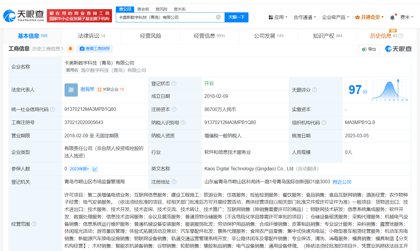 该公司成立于2018年2月,法定代表人为谢海琴,经营范围含第二类增值电信业务、互联网信息服务、建设工程施工、旅游业务、住宿服务、检验检测服务等,由海尔集团旗下卡奥斯物联科技股份有限公司全资持股。