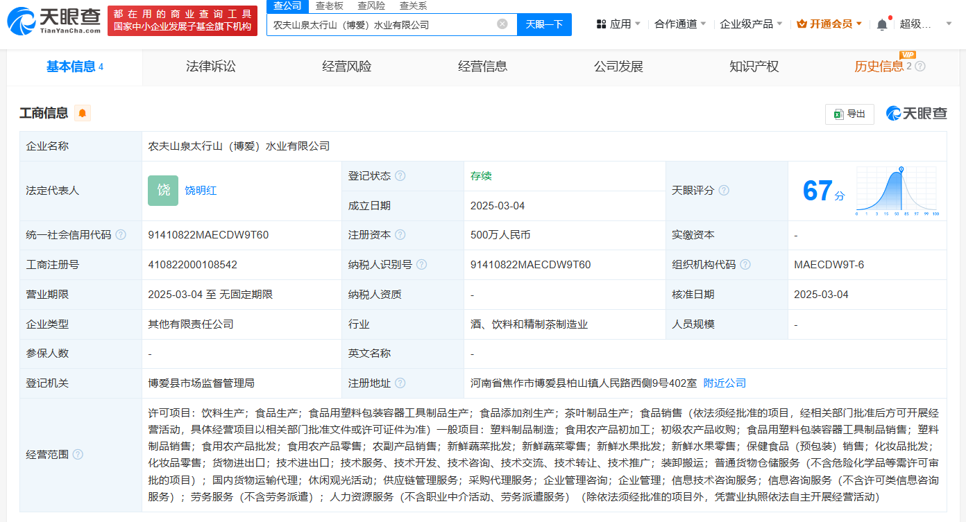 天眼查App显示,近日,农夫山泉太行山(博爱)水业有限公司、农夫山泉太行山(博爱)天然饮用水有限公司、农夫山泉太行山(博爱)饮料有限公司成立,法定代表人均为饶明红,注册资本分别为500万人民币、500万人民币、1000万人民币,经营范围包括饮料生产、食品生产、茶叶制品生产等。股东信息显示,上述公司均由农夫山泉(HK.09633) 全资持股。