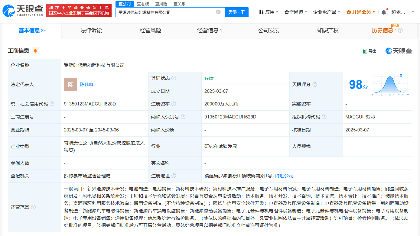 天眼查App显示,近日,罗源时代新能源科技有限公司成立,法定代表人为陈伟峰,注册资本20亿人民币,经营范围包括新兴能源技术研发、电池制造、电池销售、新材料技术研发、新材料技术推广服务等。股东信息显示,该公司由宁德时代(300750)全资持股。