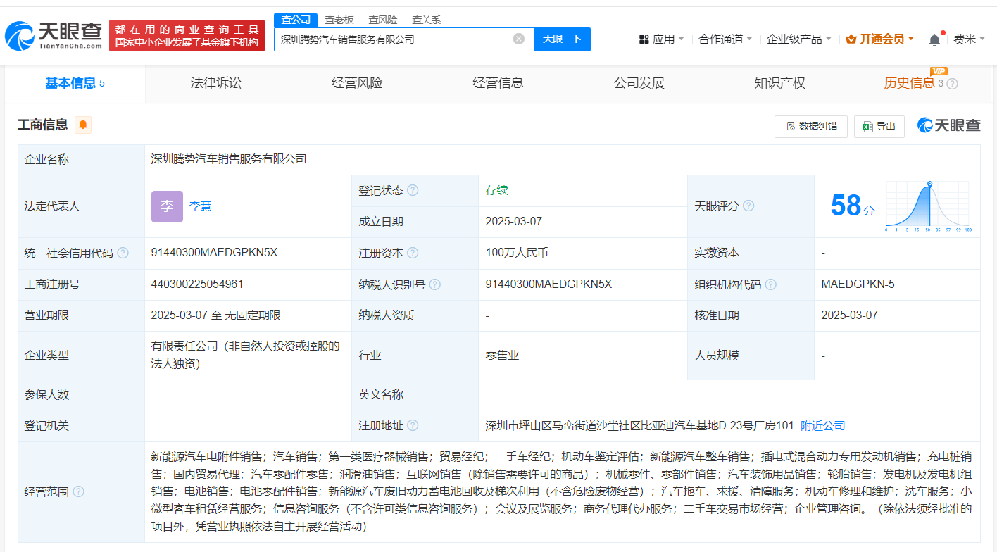 天眼查App显示,近日,深圳腾势汽车销售服务有限公司成立,法定代表人为李慧,注册资本100万人民币,经营范围含新能源汽车电附件销售、汽车销售、贸易经纪、二手车经纪、机动车鉴定评估、充电桩销售等,由比亚迪旗下腾势汽车销售服务有限公司全资持股。