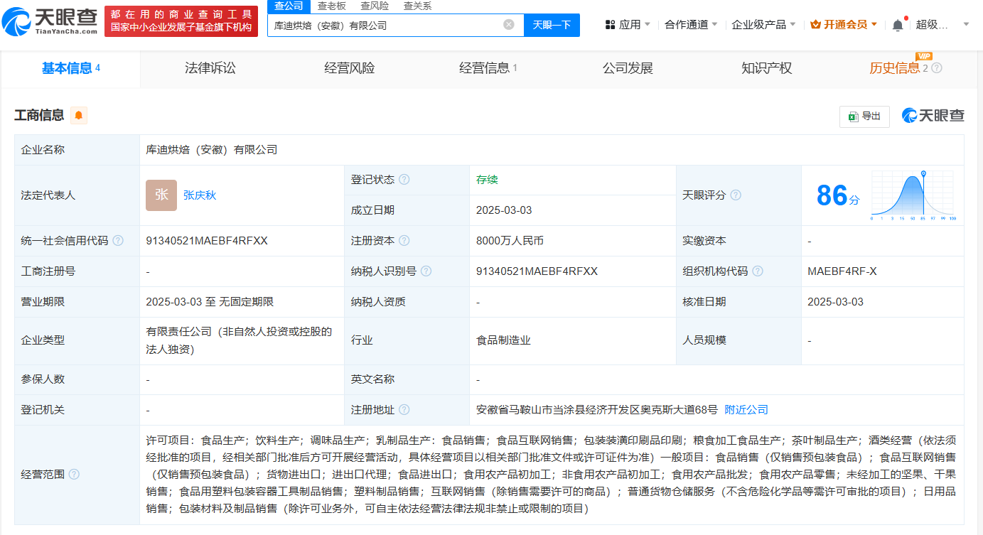 天眼查App显示,近日,库迪烘焙(安徽)有限公司成立,法定代表人为张庆秋,注册资本8000万人民币,经营范围包括食品生产、饮料生产、调味品生产、货物进出口等。股东信息显示,该公司由库迪供应链(安徽)有限公司全资持股。