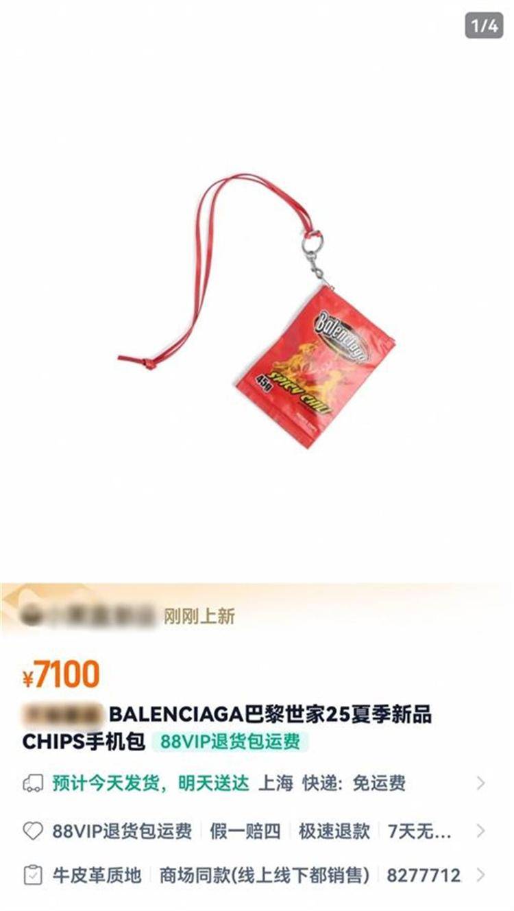 巴黎世家在某购物网站的店铺信息显示,上述名为CHIPS的手机包是2025夏季新品,肩带可拆卸,尺寸为14厘米×0.1厘米×21厘米。商品图片显示,其双面造型看上去类似薯片包装。在部分社交网站,该产品7100元的售价引发讨论。