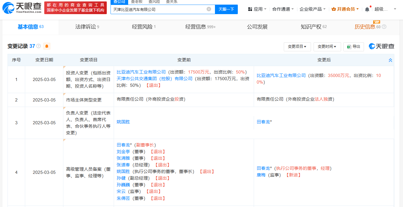 天眼查App显示,近日,天津比亚迪汽车有限公司发生工商变更,天津市公共交通集团(控股)有限公司退出股东行列,同时该公司法定代表人等主要人员均发生变更。