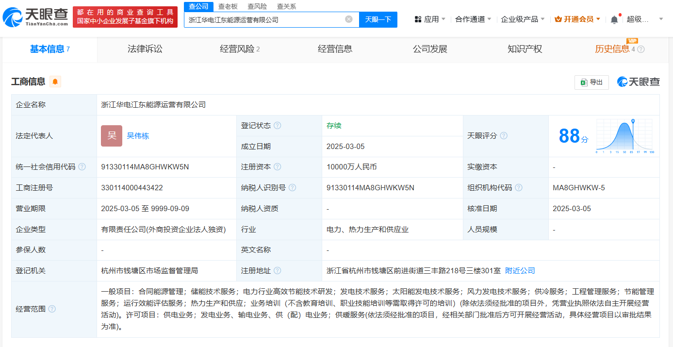 天眼查App显示,近日,浙江华电江东能源运营有限公司成立,法定代表人为吴伟栋,注册资本1亿人民币,经营范围包括合同能源管理、储能技术服务、电力行业高效节能技术研发、发电技术服务、太阳能发电技术服务等。股东信息显示,该公司由华电国际(600027)全资持股。