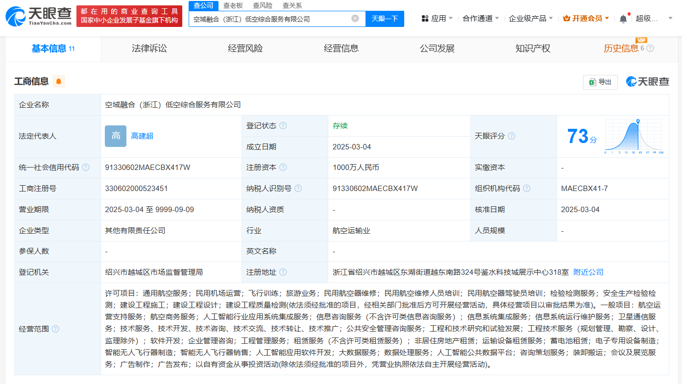天眼查App显示,近日,空域融合(浙江)低空综合服务有限公司成立,法定代表人为高建超,注册资本1000万人民币,经营范围包括通用航空服务、民用机场运营、飞行训练、旅游业务、民用航空器维修等。股权全景穿透图显示,该公司由绍兴市城发国有资产经营有限公司旗下浙江空域融合低空产业发展有限公司以及华航飞行科技(绍兴)有限公司、浙江华盛雷达股份有限公司共同持股。
