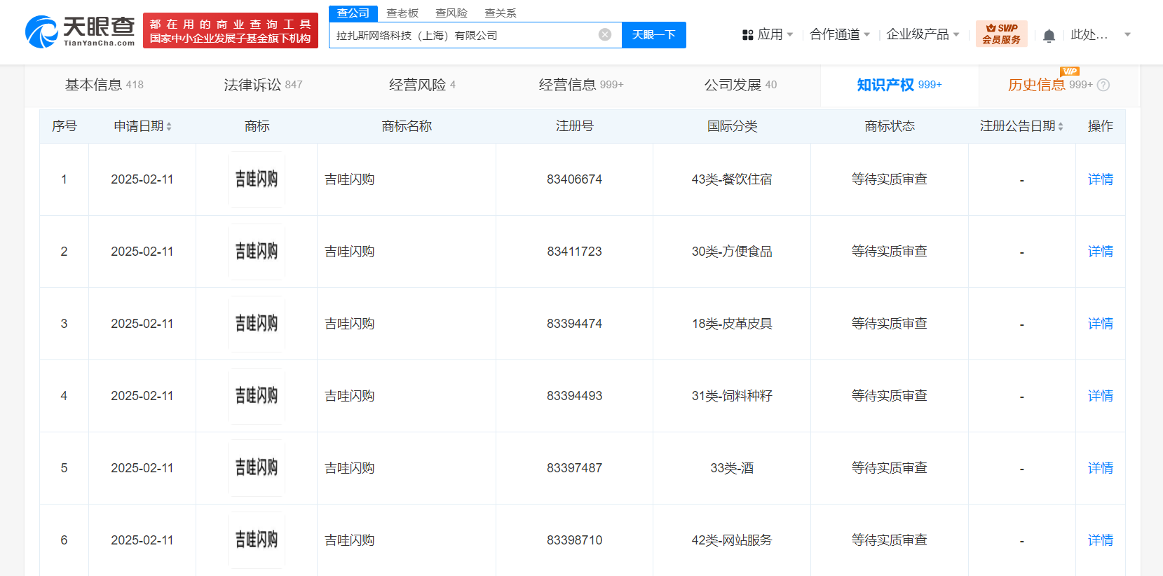 天眼查知识产权信息显示,近日,饿了么关联公司拉扎斯网络科技(上海)有限公司申请注册多枚“吉哇闪购”商标,国际分类为网站服务、餐饮住宿、教育娱乐等,当前商标状态均为等待实质审查。