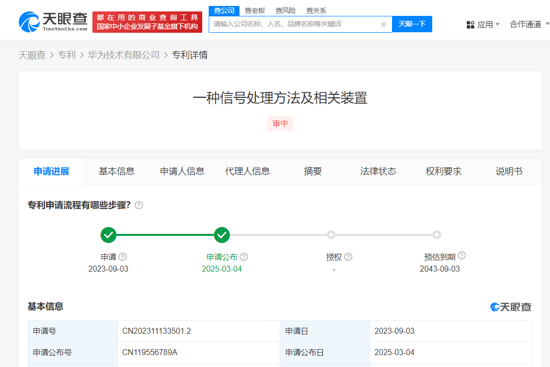 天眼查财产线索信息显示,近日,华为技术有限公司申请的“一种信号处理方法及相关装置”专利公布。