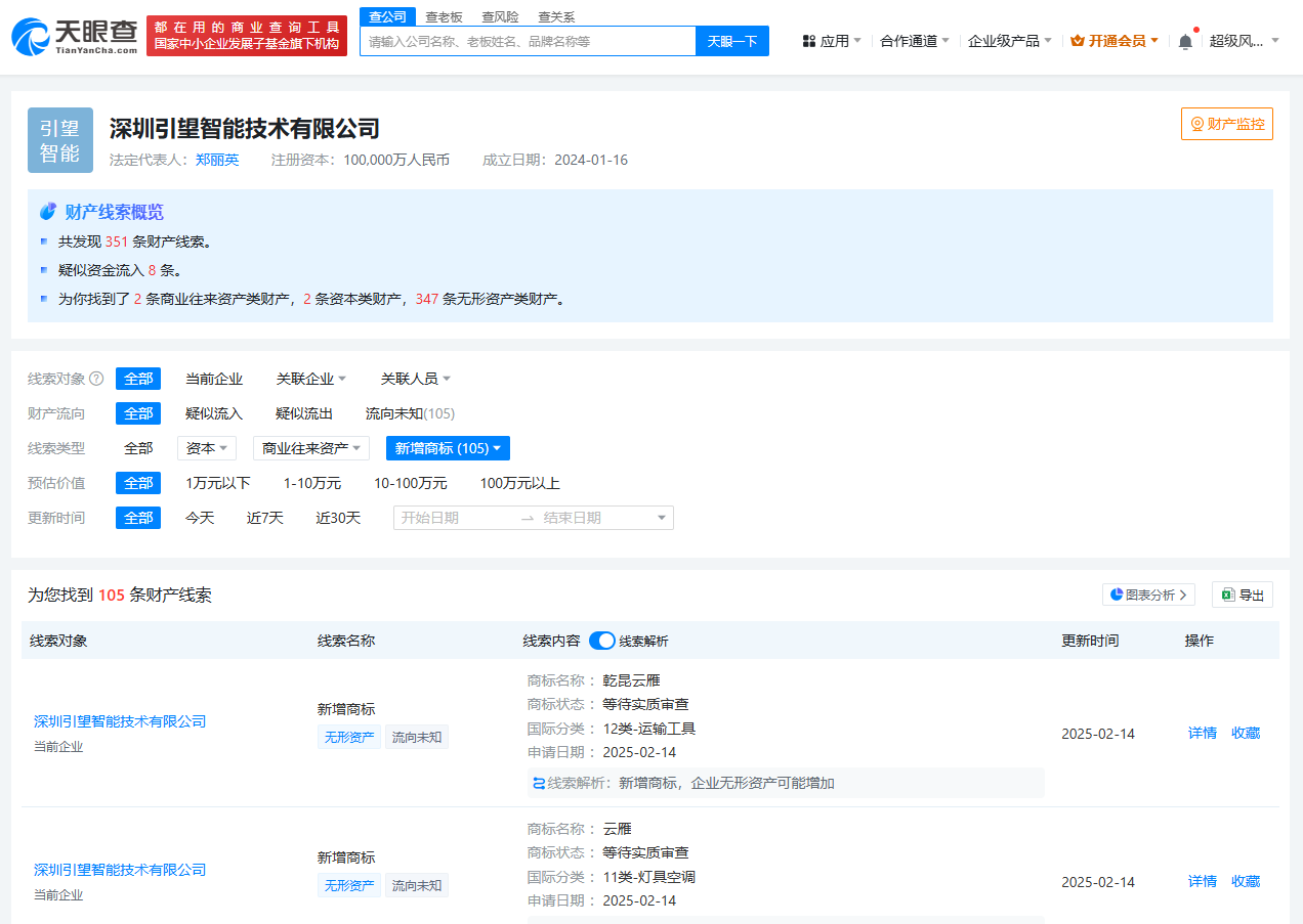 天眼查财产线索信息显示,近日,深圳引望智能技术有限公司申请注册“乾崑智行”“乾崑智能”“乾崑云雁”“乾崑纵横”“乾崑先锋”“乾崑寻迹”商标,国际分类涉及运输工具、广告销售、网站服务等,当前商标状态均为等待实质审查。