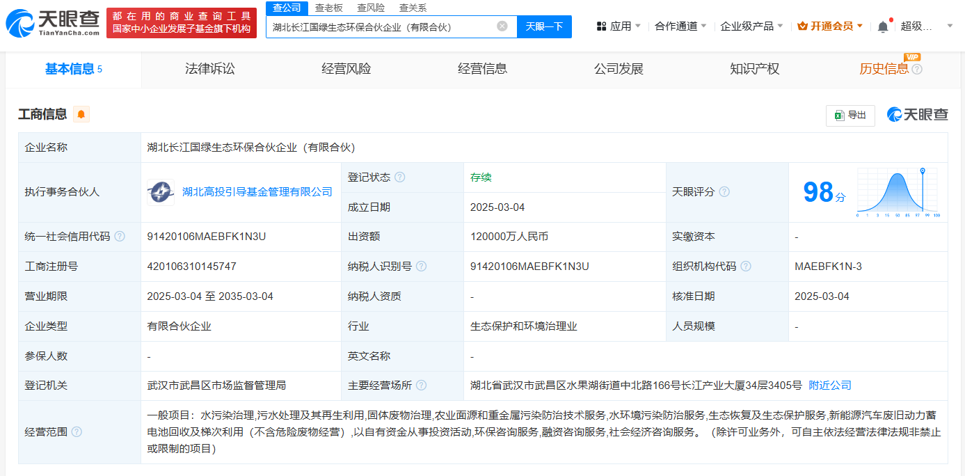 天眼查App显示,近日,湖北长江国绿生态环保合伙企业(有限合伙)成立,执行事务合伙人为湖北高投引导基金管理有限公司,出资额12亿人民币,经营范围包括水污染治理、污水处理及其再生利用、固体废物治理、农业面源和重金属污染防治技术服务等。合伙人信息显示,该企业由国家绿色发展基金股份有限公司、湖北省生态环保有限公司、湖北高投引导基金管理有限公司共同出资。