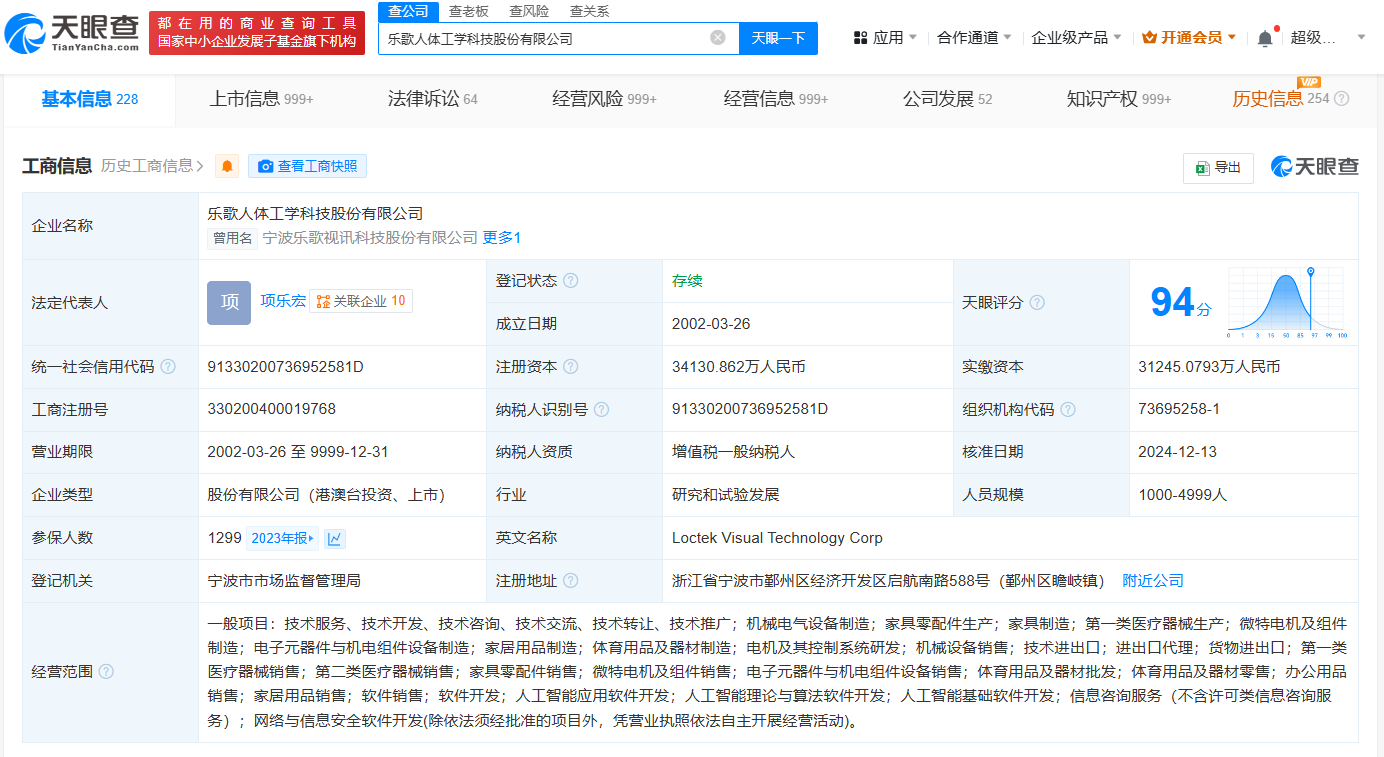 该公司成立于2002年3月,法定代表人为项乐宏,注册资本约3.4亿人民币,经营范围包括机械电气设备制造、家具零配件生产、家具制造、人工智能应用软件开发等,由宁波丽晶电子集团有限公司、丽晶(香港)国际有限公司等共同持股。