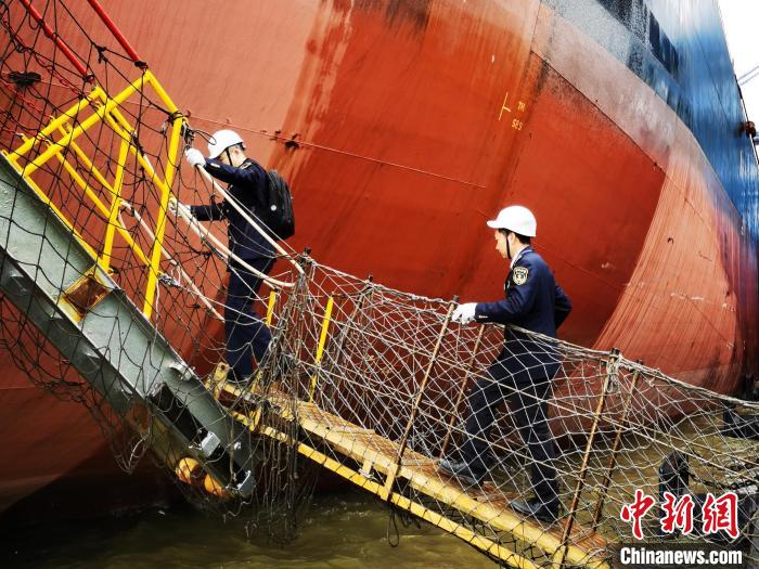 海事执法人员登上“新东莞16”轮。 王霖 摄