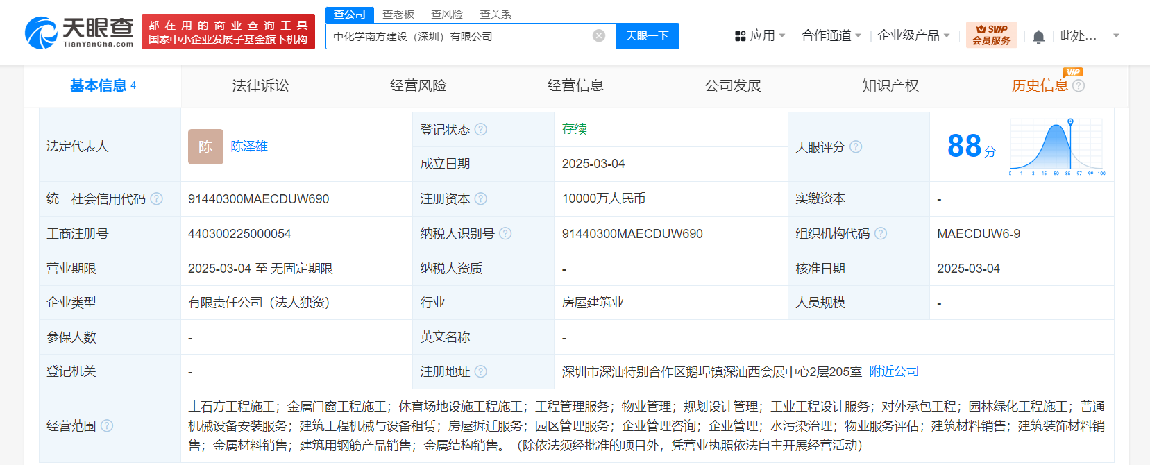 天眼查App显示,近日,中化学南方建设(深圳)有限公司成立,法定代表人为陈泽雄,注册资本1亿人民币,经营范围含土石方工程施工、金属门窗工程施工、体育场地设施工程施工、工程管理服务、物业管理、规划设计管理、工业工程设计服务、对外承包工程、园林绿化工程施工、企业管理咨询等。股东信息显示,该公司由中国化学工程集团旗下中化学南方建设投资有限公司全资持股。