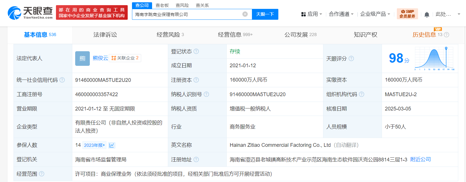 该公司成立于2021年1月,法定代表人为熊俊云,经营范围为商业保理业务。股东信息显示,该公司由抖音视界有限公司全资持股。