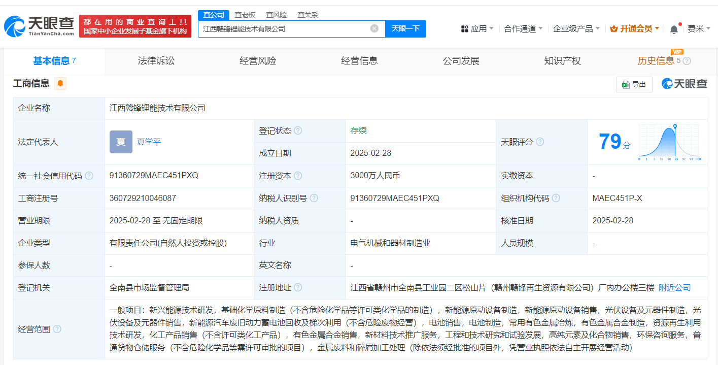 天眼查App显示,近日,江西赣锋锂能技术有限公司成立,法定代表人为夏学平,注册资本3000万人民币,经营范围含新兴能源技术研发、基础化学原料制造、新能源原动设备制造、新能源原动设备销售、光伏设备及元器件制造、电池制造等,由赣锋锂业(002460)旗下江西赣锋循环科技有限公司、海名斯能源(江西)有限公司分别持股51%、49%。