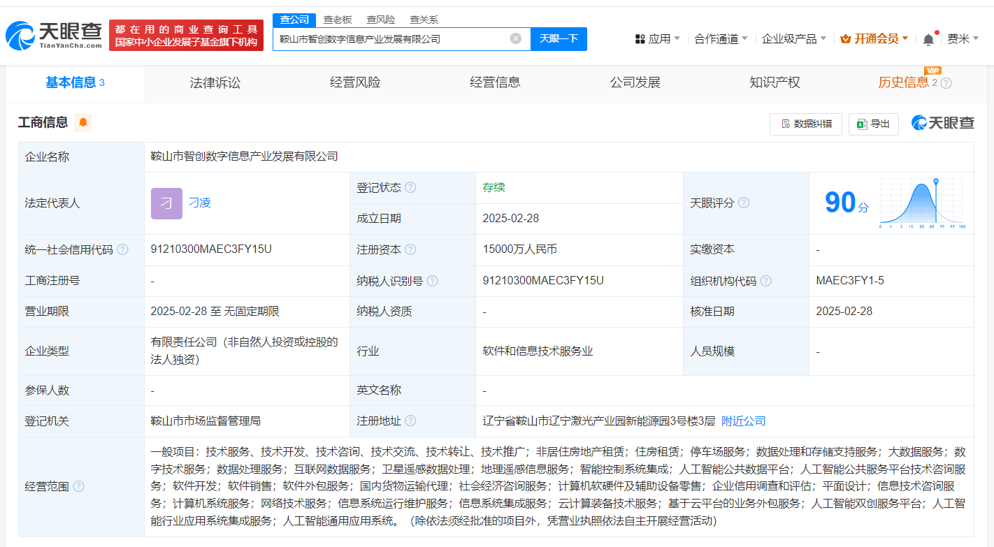 天眼查App显示,近日,鞍山市智创数字信息产业发展有限公司成立,法定代表人为刁凌,注册资本1.5亿人民币,经营范围含非居住房地产租赁、住房租赁、智能控制系统集成、人工智能公共数据平台、人工智能公共服务平台技术咨询服务、软件开发等,由辽宁新鞍控股投资有限公司全资持股。
