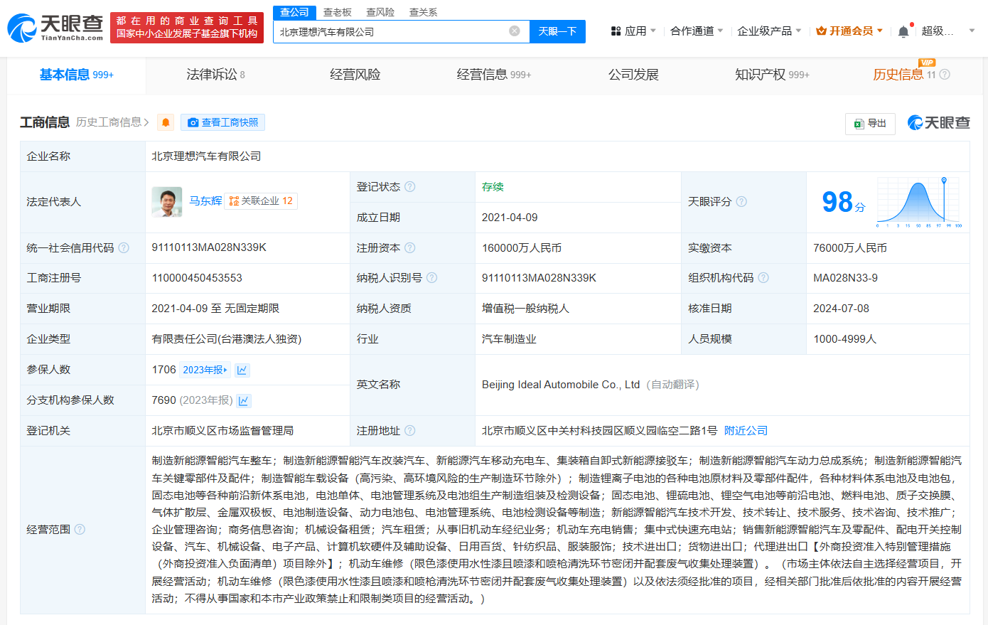 该公司成立于2021年4月,法定代表人为马东辉,注册资本16亿人民币,经营范围包括制造新能源智能汽车整车、从事旧机动车经纪业务、集中式快速充电站等,由Leading Ideal HK Limited全资持股。