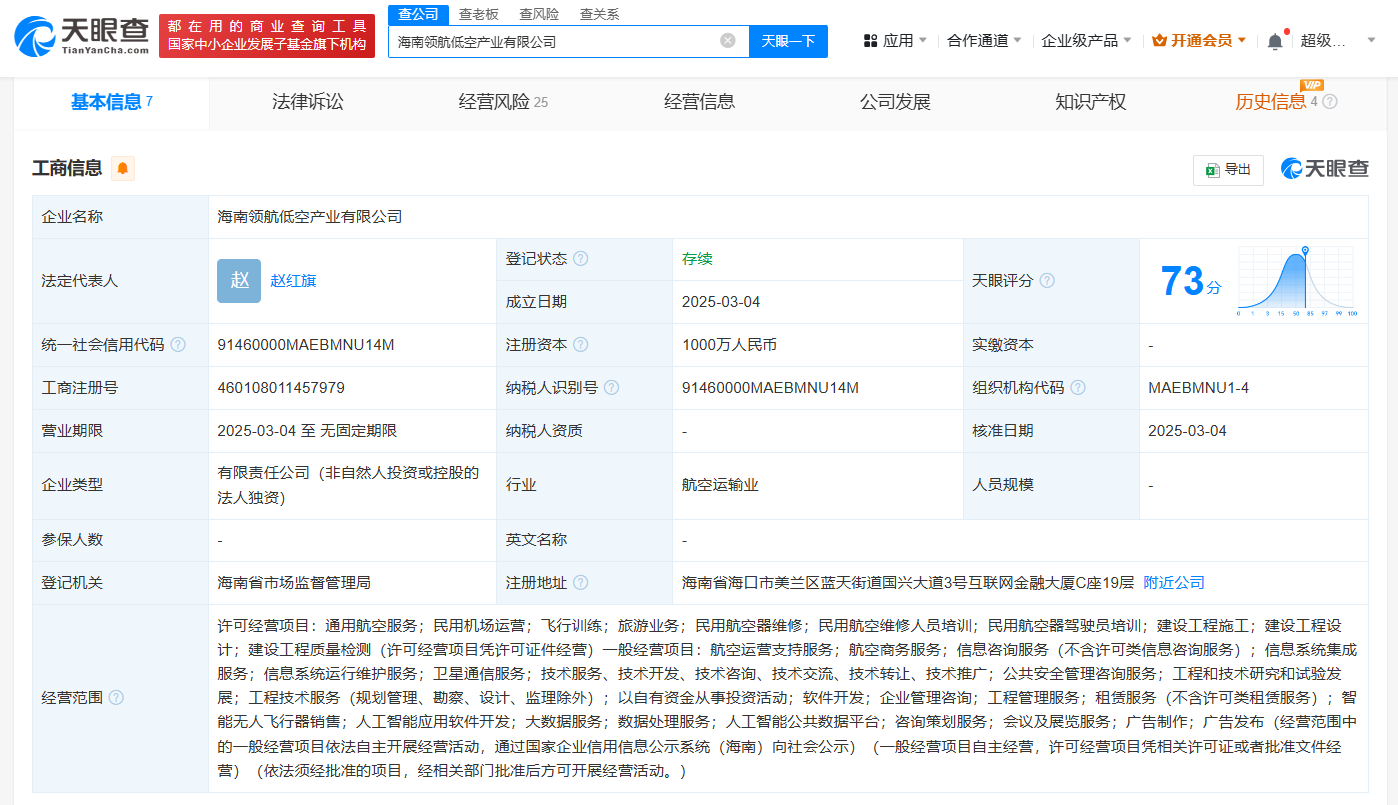 天眼查App显示,近日,海南领航低空产业有限公司成立,法定代表人为赵红旗,注册资本1000万人民币,经营范围包括通用航空服务、民用机场运营、飞行训练、旅游业务、航空运营支持服务等。股东信息显示,该公司由海南机场(600515)全资持股。