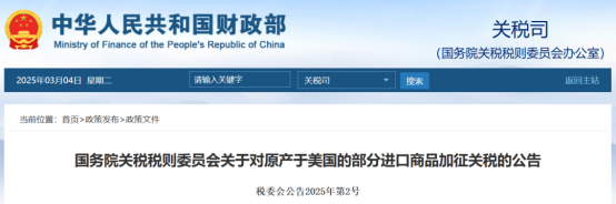 3月4日,国务院关税税则委员会发布《国务院关税税则委员会关于对原产于美国的部分进口商品加征关税的公告》。