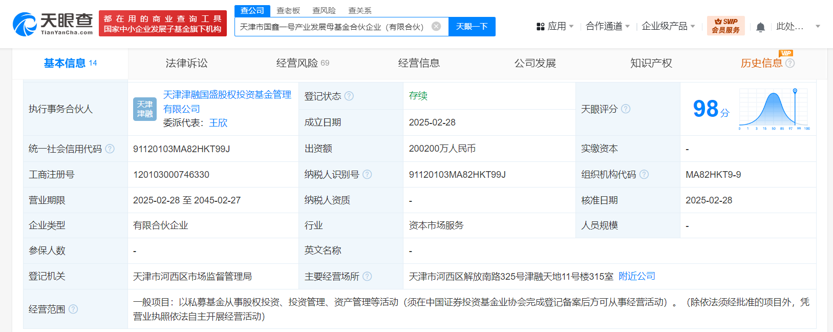 天眼查App显示,近日,天津市国鑫一号产业发展母基金合伙企业(有限合伙)成立,执行事务合伙人为天津津融国盛股权投资基金管理有限公司,出资额20.02亿人民币,经营范围为以私募基金从事股权投资、投资管理、资产管理等活动。合伙人信息显示,该基金由天津津融投资服务集团有限公司、天津津智国有资本投资运营有限公司、天津国有资本投资运营有限公司、天津泰达投资控股有限公司等共同出资。