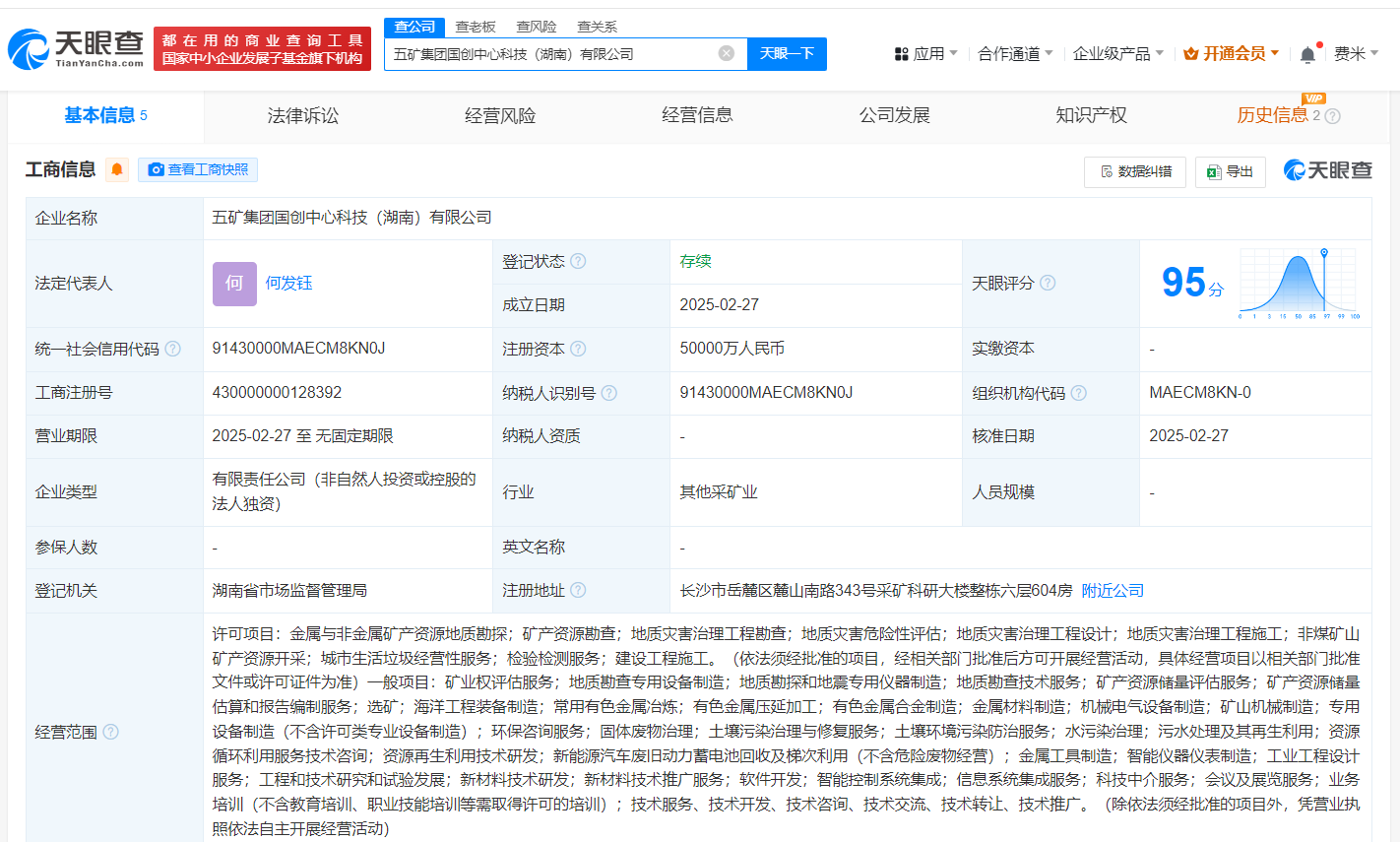 天眼查App显示,近日,五矿集团国创中心科技(湖南)有限公司成立,法定代表人为何发钰,注册资本5亿人民币,经营范围含金属与非金属矿产资源地质勘探、矿产资源勘查、地质灾害治理工程勘查、地质灾害危险性评估、地质灾害治理工程设计、建设工程施工等,由中国五矿集团有限公司全资持股。