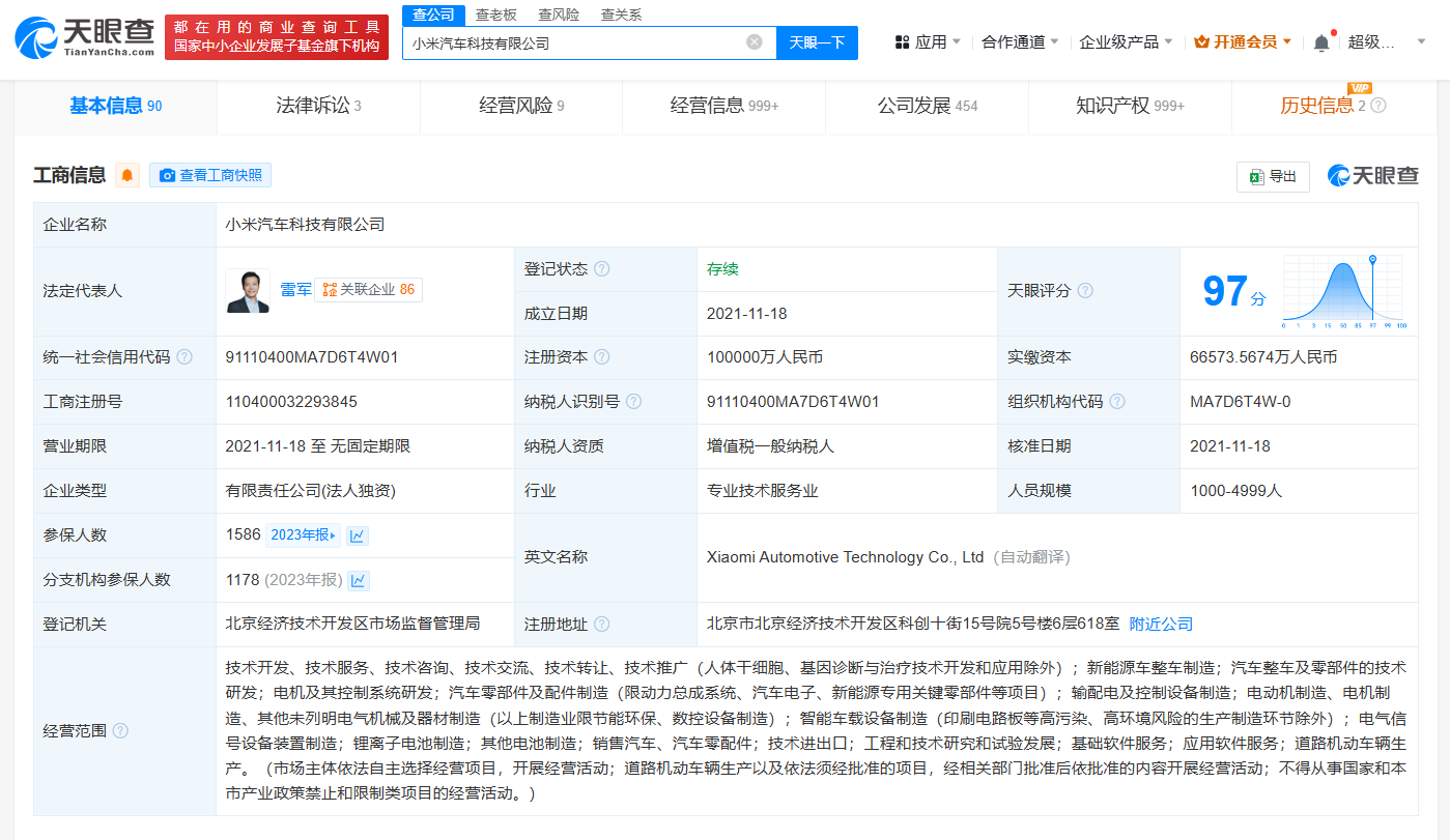 该公司成立于2021年11月,法定代表人为雷军,注册资本10亿人民币,经营范围包括新能源车整车制造、汽车整车及零部件的技术研发、电机及其控制系统研发、汽车零部件及配件制造等,由小米科技有限责任公司全资持股。