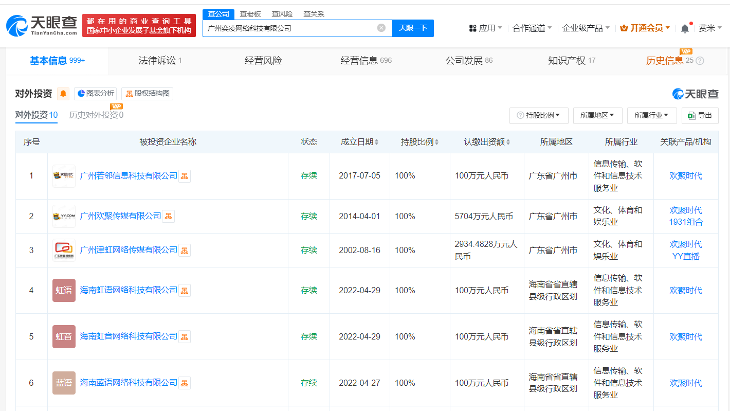 广州奕凌网络科技有限公司成立于2018年10月,法定代表人为李乐,注册资本9400万人民币,经营范围含游戏软件设计制作、信息系统集成服务、数据处理和存储服务等。对外投资信息显示,该公司全资持股YY直播关联公司广州津虹网络传媒有限公司。