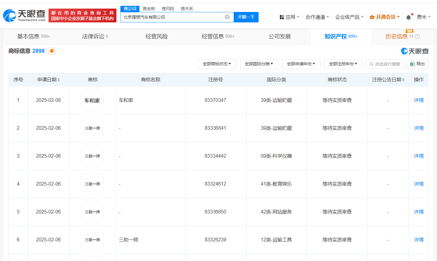 天眼查知识产权信息显示,近日,北京理想汽车有限公司申请注册多枚“三助一师”商标,国际分类包含运输工具、网站服务、教育娱乐等,当前商标状态均为等待实质审查。