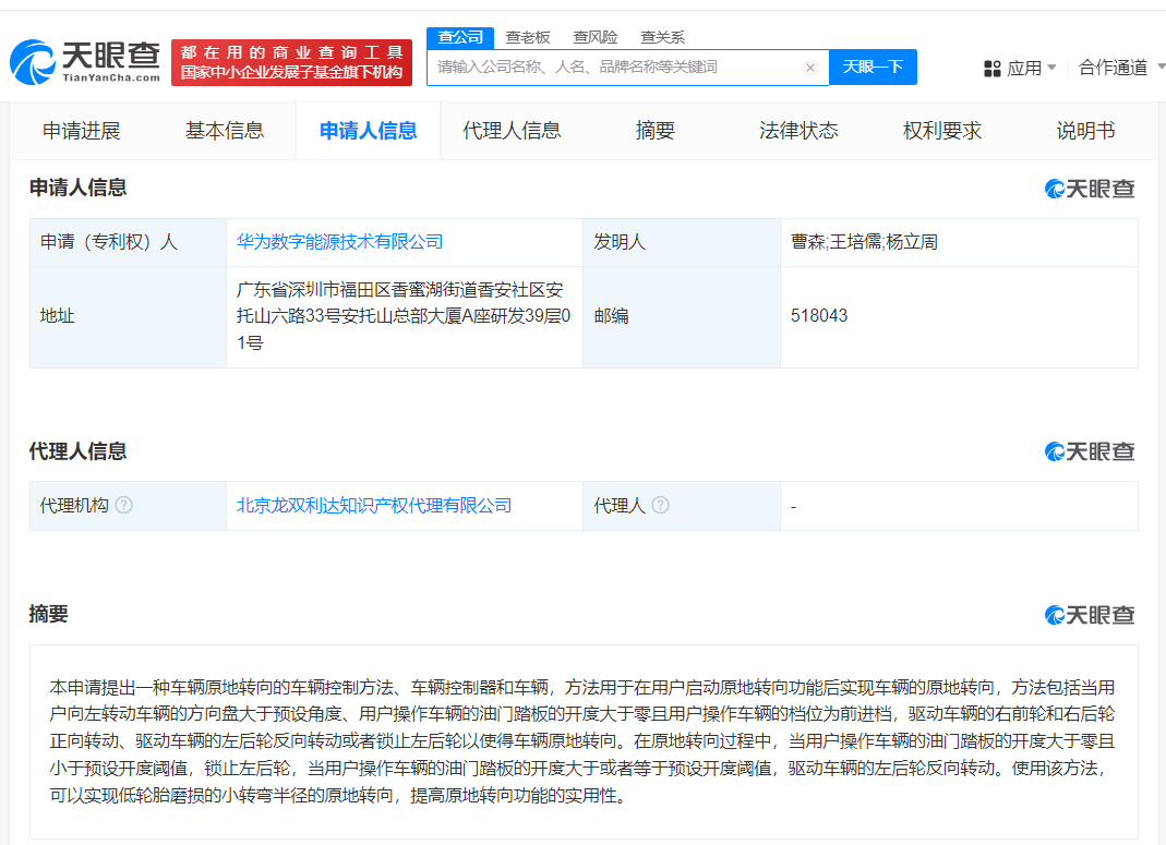 天眼查知识产权信息显示,近日,华为数字能源技术有限公司申请的“实现车辆原地转向的车辆控制方法、车辆控制器和车辆”专利公布。