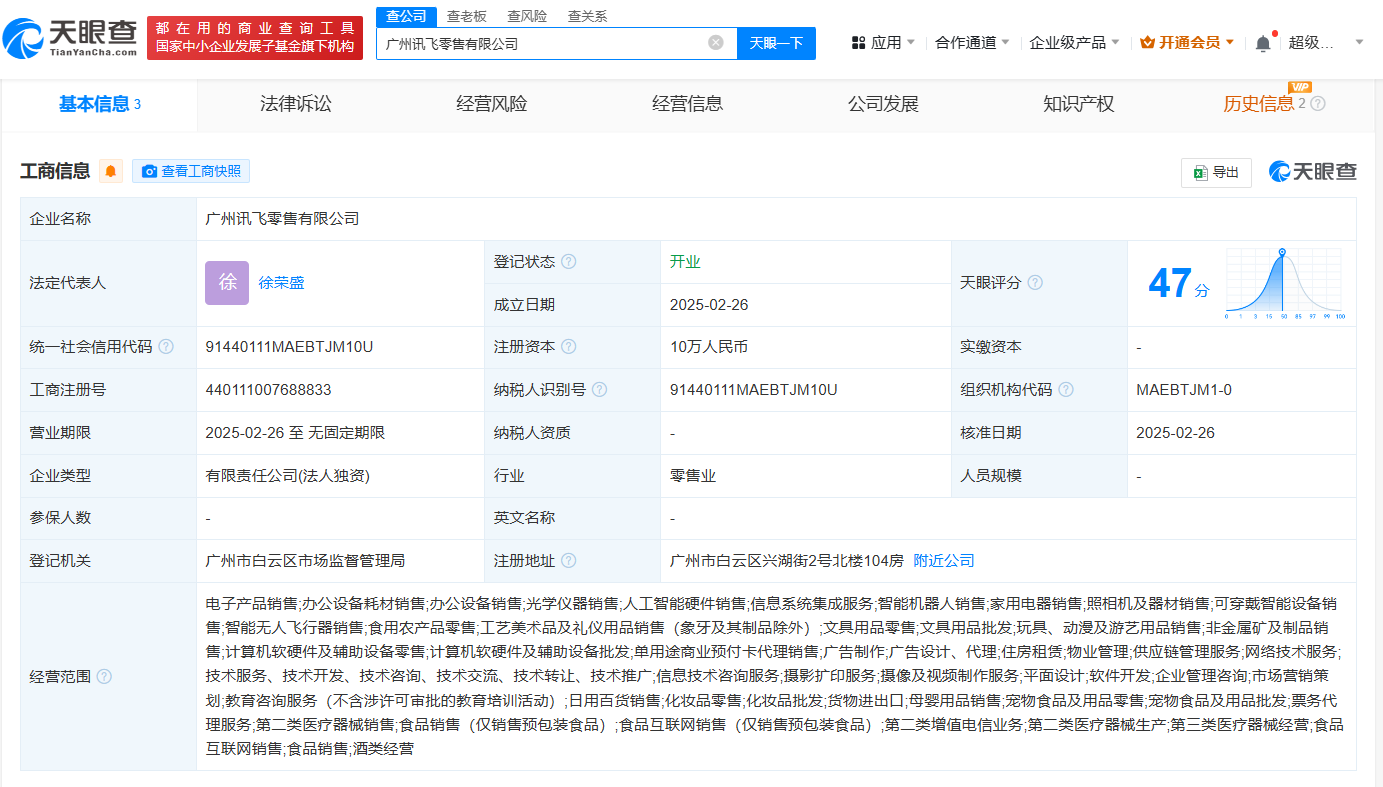 天眼查App显示,近日,广州讯飞零售有限公司、石家庄科大讯飞新零售有限公司成立,法定代表人均为徐荣盛,注册资本均为10万人民币,经营范围包括人工智能硬件销售、智能家庭消费设备制造、智能机器人销售、智能无人飞行器销售等。股东信息显示,上述公司均由科大讯飞(002230)旗下安徽讯飞新零售有限公司全资持股。
