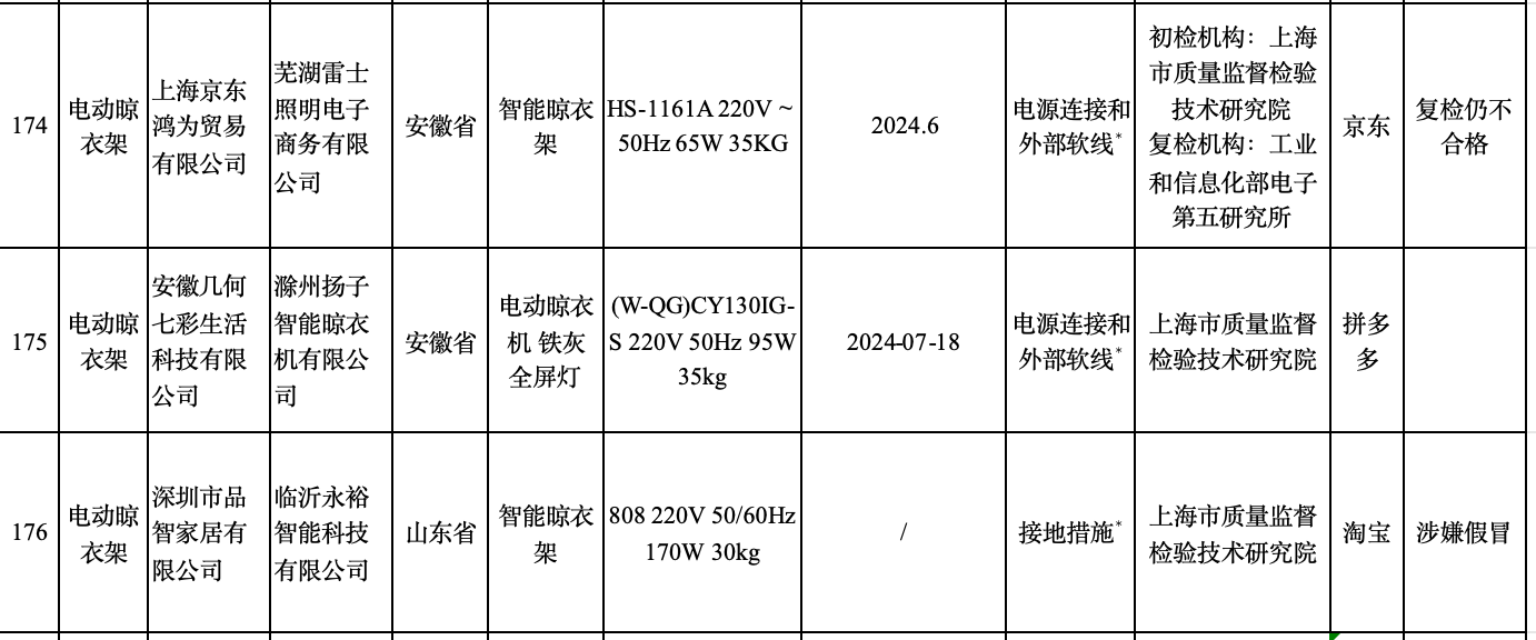 不合格名单显示,标称芜湖雷士照明电子商务有限公司生产的智能晾衣架(生产日期/批号HS-1161A 220V~ 50Hz 65W 35KG;生产日期/批号2024.6),电源连接和外部软线不合格,且复检仍不合格;标称滁州扬子智能晾衣机有限公司生产的电动晾衣机(铁灰 全屏灯)(规格型号(W-QG)CY130IG-S 220V 50Hz 95W 35kg;生产日期/批号2024-07-18),电源连接和外部软线不合格;标称临沂永裕智能科技有限公司生产的智能晾衣架(规格型号808 220V 50/60Hz 170W 30kg),接地措施,且涉嫌假冒。