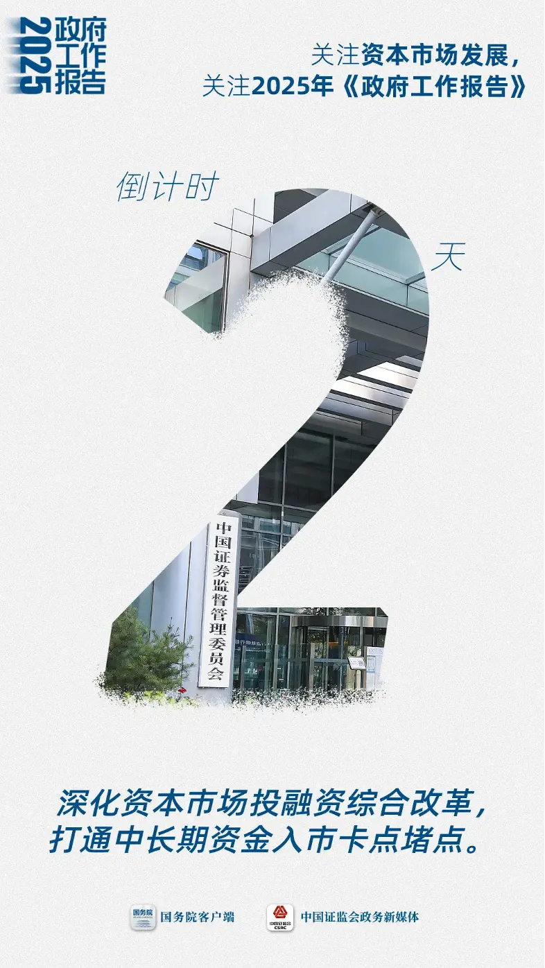 3月3日,证监会官网罕见发布了两会倒计时海报,“倒计时2天,关注资本市场发展,关注2025年《政府工作报告》,”从海报信息来看,证监会期待政府工作汇报关于“深化资本市场投融资综合改革,打通中长期资金入市卡点堵点”内容。
