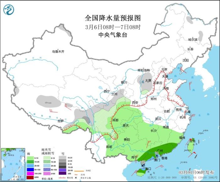 3月5日08时至6日08时,新疆南疆盆地、西藏东部、西北地区东部等地的部分地区有小雪或雨夹雪,其中,西藏东北部、青海东部、甘肃南部、川西高原北部等地的部分地区有中到大雪(5~8毫米)。西南地区东部、江南、华南、台湾岛等地的部分地区有小到中雨,其中,广西东南部沿海、广东西部、台湾岛西北部等地的部分地区有大雨(25~30毫米)。内蒙古东北部、西藏北部、浙江东部等地的部分地区有4~6级风,局地阵风7~8级。