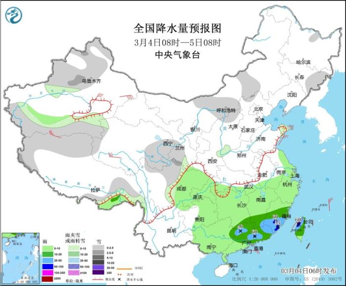 3月4日08时至5日08时,新疆北疆和南疆盆地、西藏北部和东南部、内蒙古中西部、西北地区东南部、川西高原北部、吉林东部、山东半岛等地的部分地区有小雪或雨夹雪,局地有中雪。江南东部和南部、华南北部、台湾岛等地的部分地区有中到大雨,其中,福建东南部、广东东南部等地局地有暴雨(50~60毫米)。新疆南疆盆地、青海南部等地的部分地区有4~6级风,局地阵风6~7级。